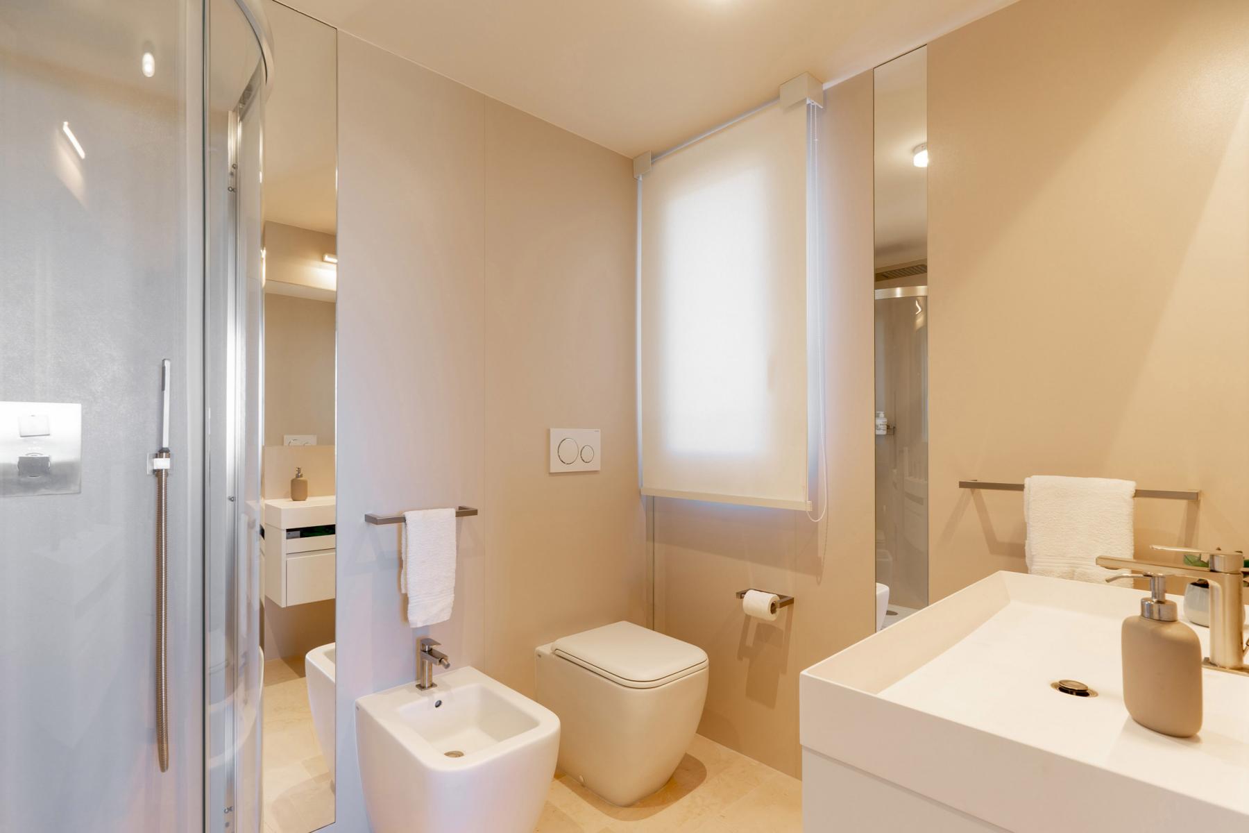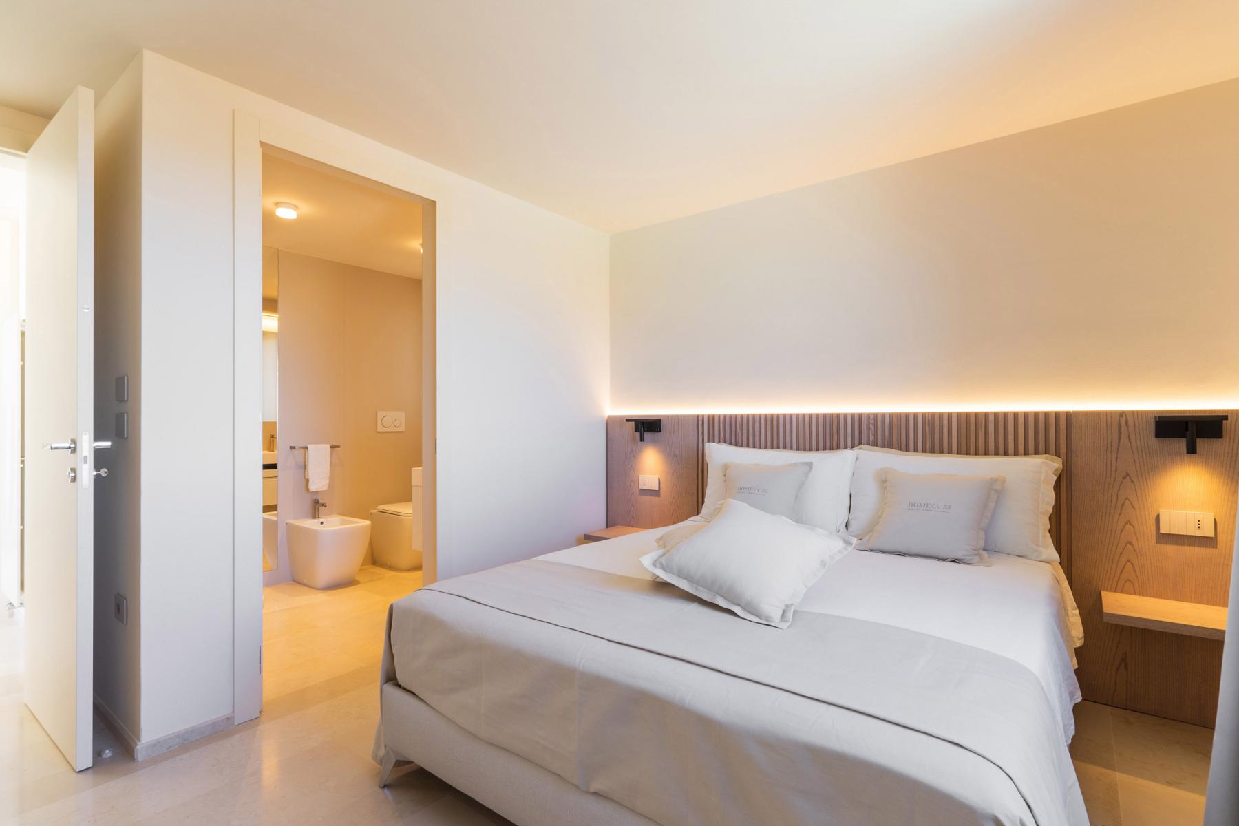 The super-equipped kitchen overlooks the living room, furnished with a dining table and chairs. The living area is completed by a bathroom. On this floor there are also 2 double bedrooms with private bathrooms.