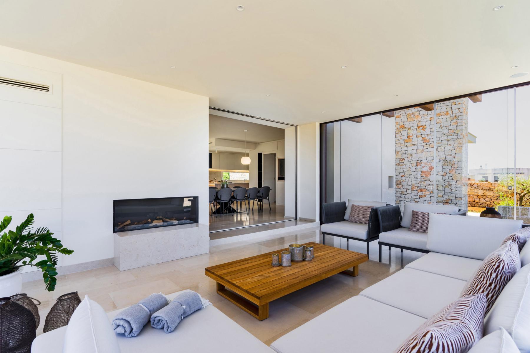 On the ground floor, there is an enclosed veranda with glass windows overlooking the pool and a comfortable lounge enriched by a fireplace with tempered glass.